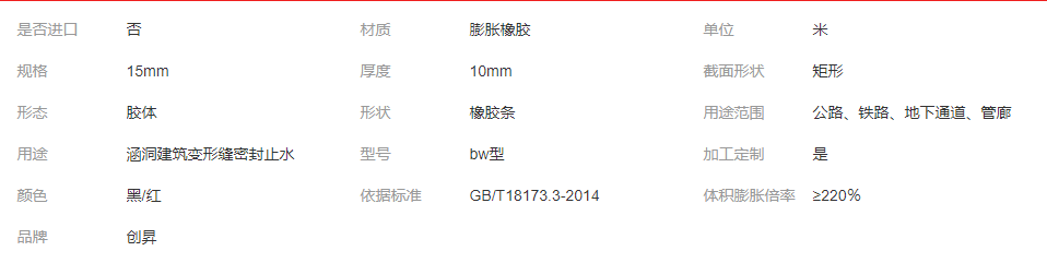 本网页所展示的有关【膨胀止水条 腻子型 10*15mm bw型 缓膨胀止水橡胶 热电厂接缝止水胶条_止水条_ 衡水中创止水材料有限公司】的信息/图片/参数等由市政工程网的会员【 衡水中创止水材料有限公司】提供,由市政工程网会员【 衡水中创止水材料有限公司】自行对信息/图片/参数等的真实性、准确性和合法性负责,本平台(本网站)仅提供展示服务,请谨慎交易,因交易而产生的法律关系及法律纠纷由您自行协商解决,本平台(本网站)对此不承担任何责任。您在本网页可以浏览【膨胀止水条 腻子型 10*15mm bw型 缓膨胀止水橡胶 热电厂接缝止水胶条_止水条_ 衡水中创止水材料有限公司】有关的信息/图片/价格等及提供【膨胀止水条 腻子型 10*15mm bw型 缓膨胀止水橡胶 热电厂接缝止水胶条_止水条_ 衡水中创止水材料有限公司】的商家公司简介、联系方式等信息。